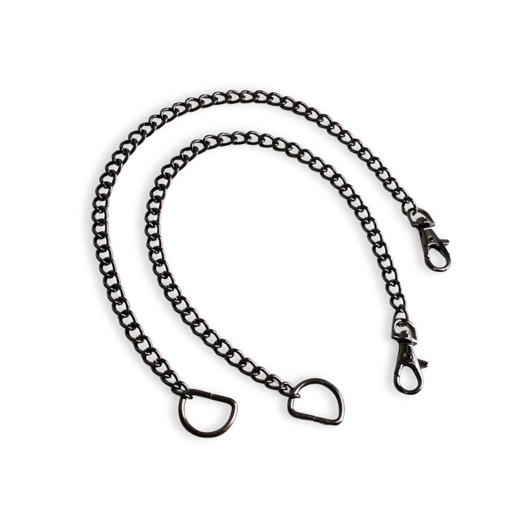 Zestaw dwóch metalowych łańcuszków przeznaczonych do samodzielnego wykonania rączki/paska do torebki. Każdy łańcuszek zakończony jest z jednej strony solidnym karabińczykiem, z drugiej metalowym półkółkiem, do którego można przyszydełkować rączkę wykonaną np. ze sznurka poliestrowego. Gotową rączkę/pasek mocuje się do torebki za pomocą karabińczyków – bez potrzeby stosowania dodatkowych narzędzi.
