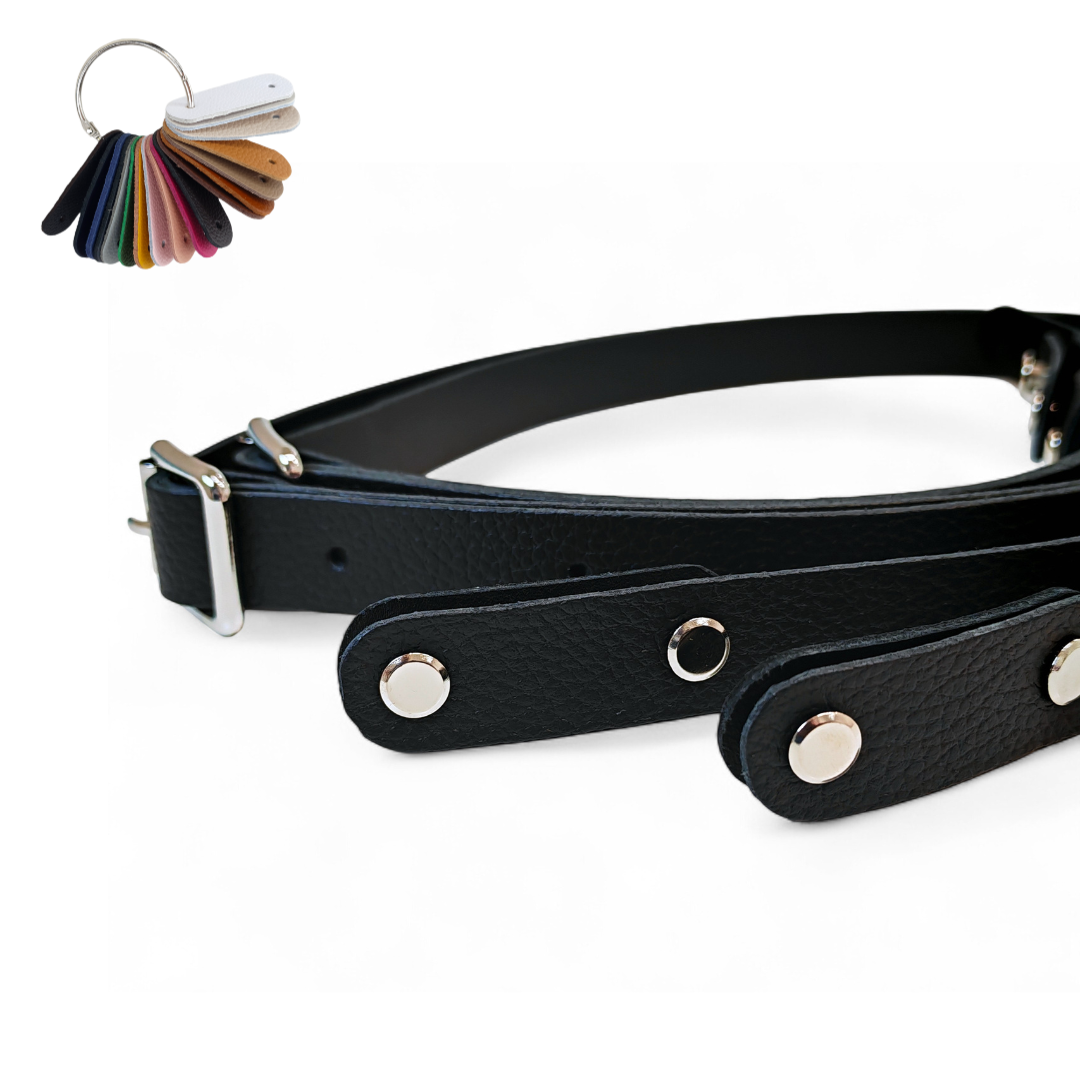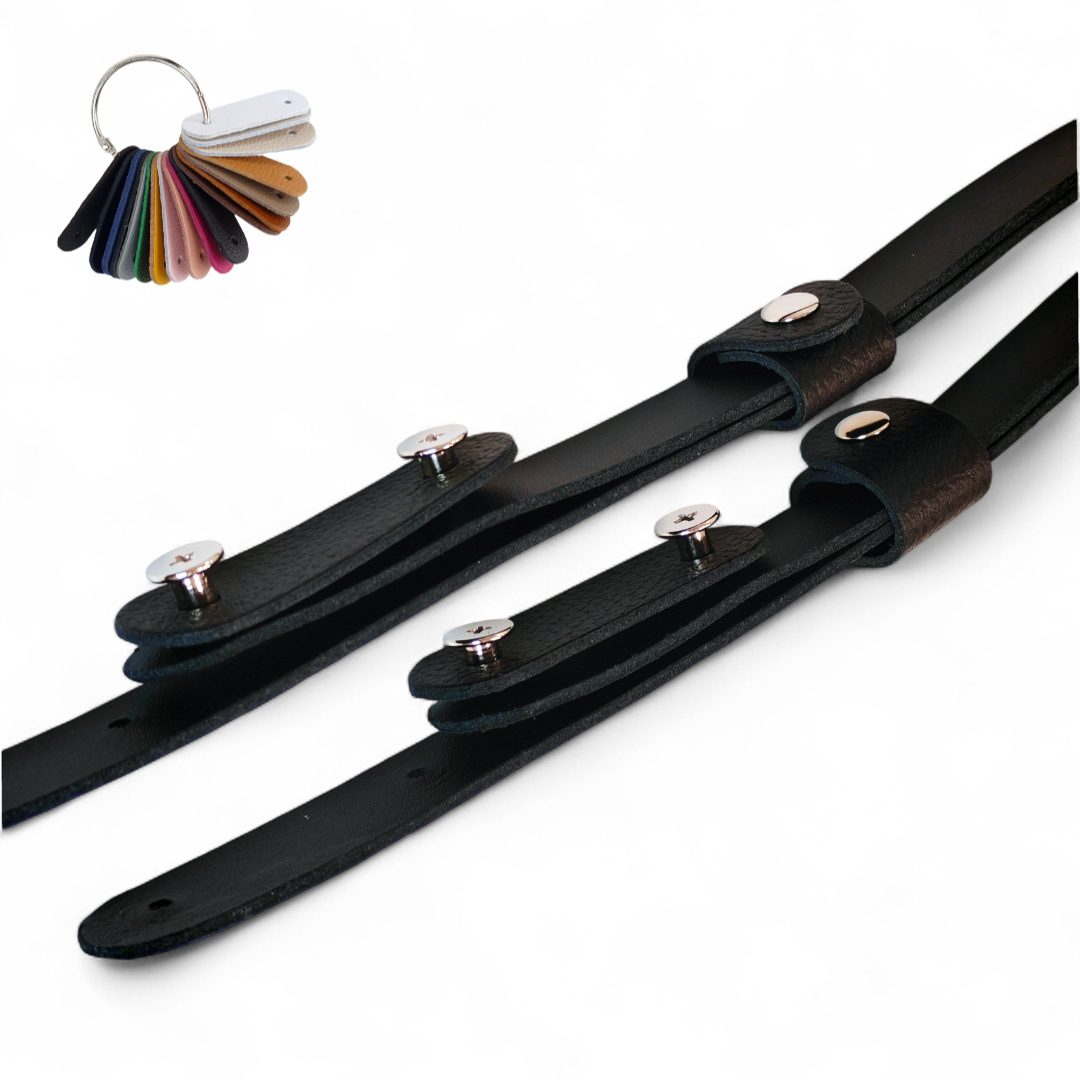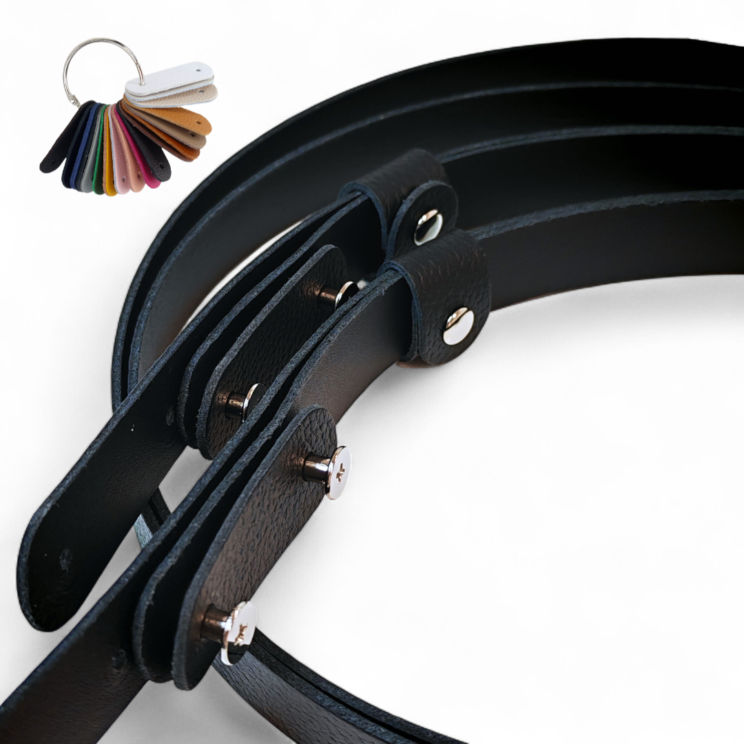Paski regulowane ze skóry naturalnej zakończone 2 nitami skręcanymi i klamerką do regulacji długości, łączone z 2 elementów skórzanych: paska 95 cm i paska 30 cm.