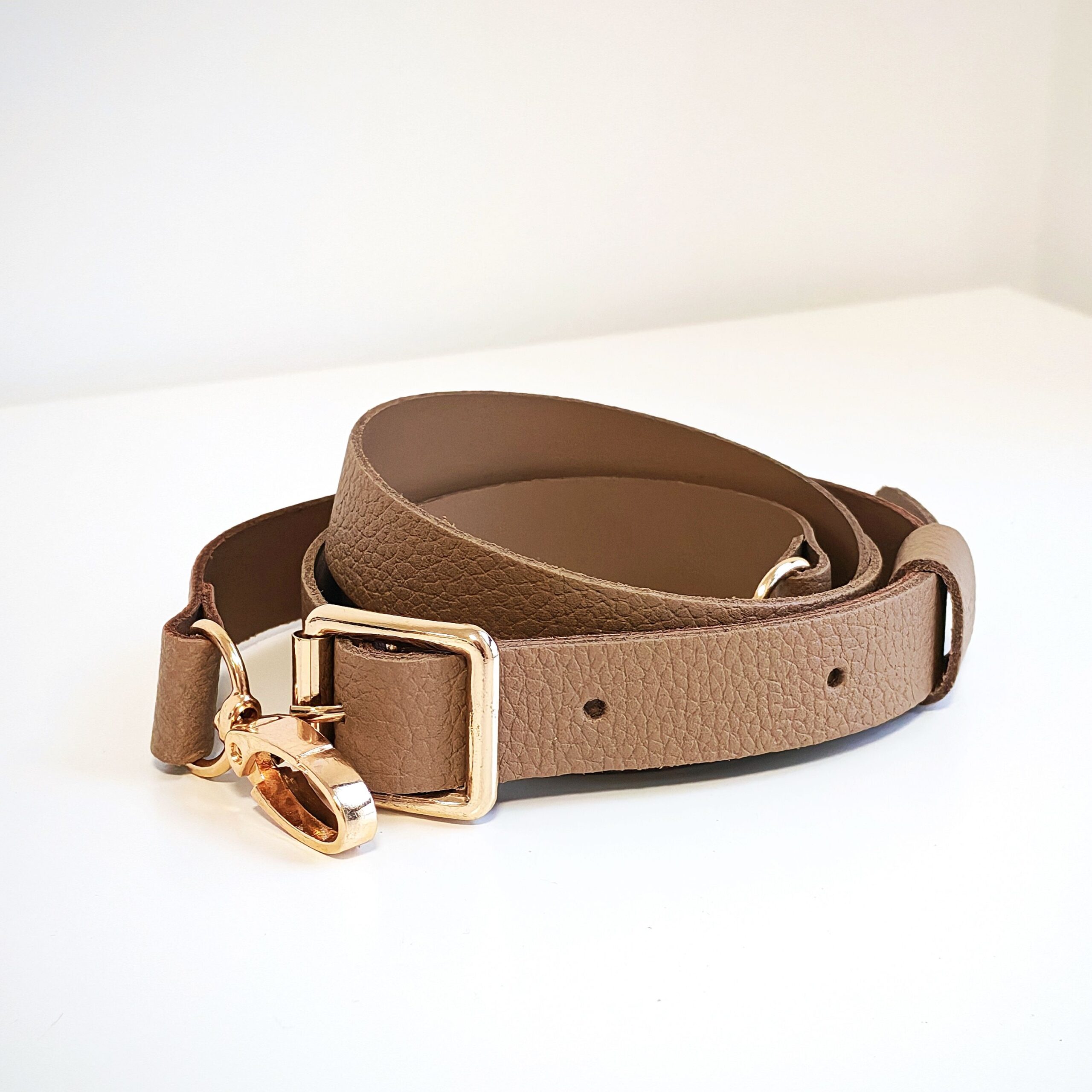 Pasek regulowany ze skóry naturalnej z karabińczykami i klamerką do regulacji długości, łączony z 2 elementów skórzanych
